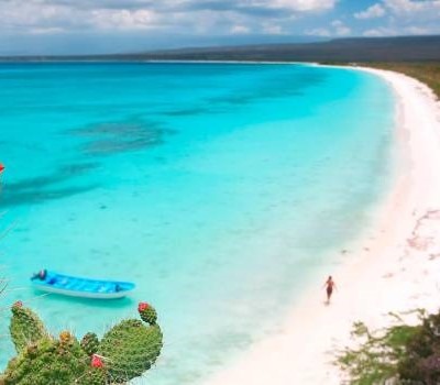 Reconocida como la playa más hermosa de República Dominicana y el Caribe, y parte del Parque Nacional Jaragua, este tramo de arena blanca brillante es bañado con aguas cristalinas de color turquesa y un espectacular paisaje kárstico rocoso que abraza la playa a lo largo de toda la costa, desde las alturas la vista no tiene precedentes.